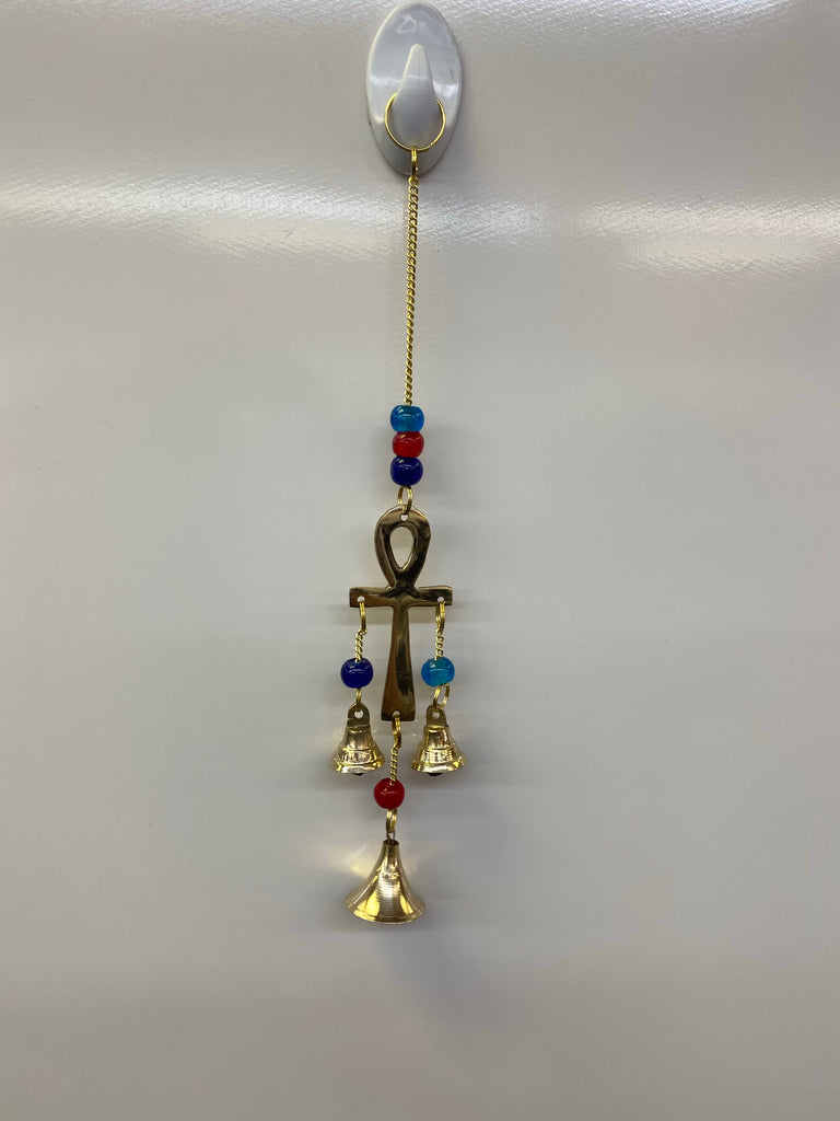 this wind chime displays a smooth brass toned Ankh. Hanging from its points are three brass bells hanging beneath.
