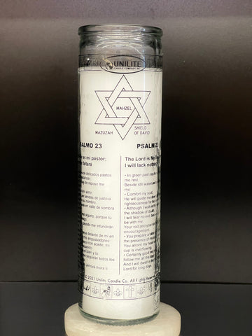 This classic white candle is spiritually charged with Psalm 23, a sacred scripture of divine provision, guidance, and favor. Featuring the Shield of David and dual-language text in English and Spanish, this candle is ideal for rituals involving protection, peace of mind, and resolution in challenging times.