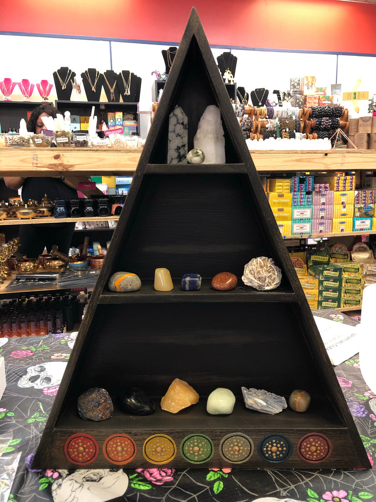 This Chakra Wooden Altar Shelf featuring chakra art is made in Indonesia.