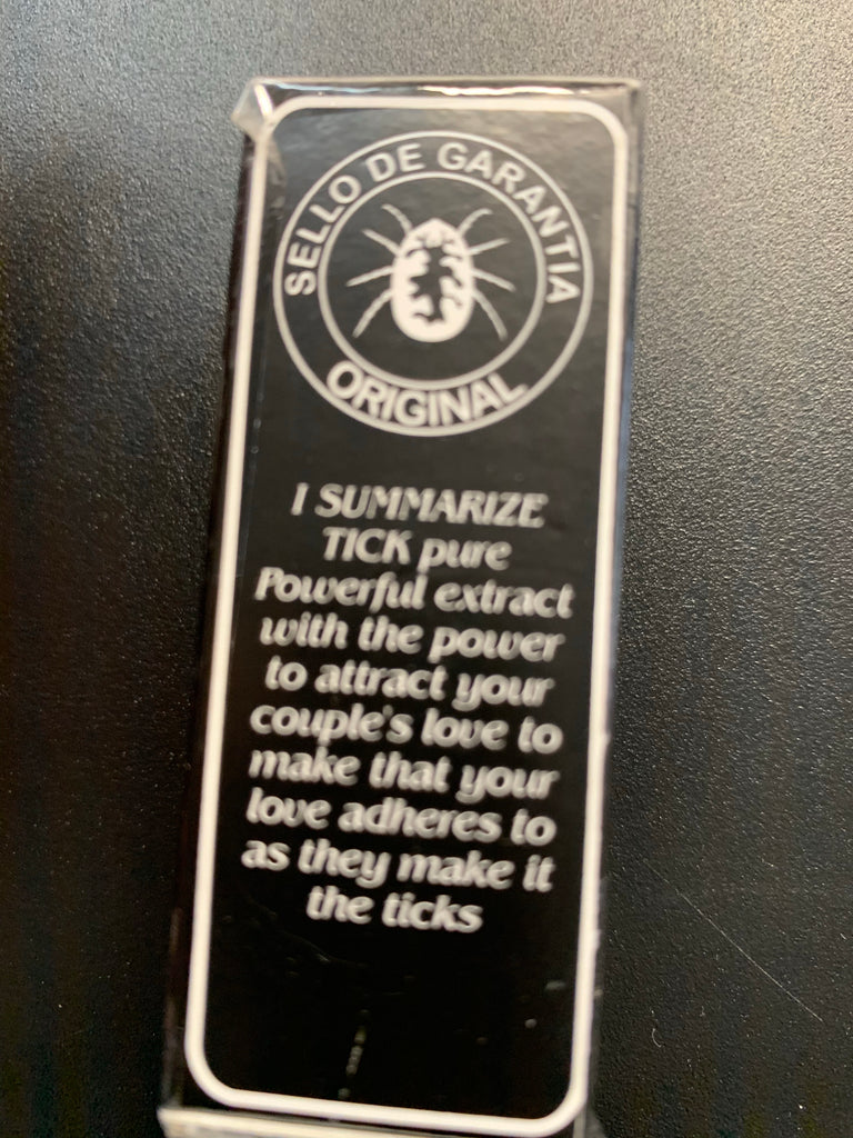 This powerful extract attracts your love and makes them cling to it as a tick does. Great for any type of work where you want something to “stick” money, love, job, health, etc