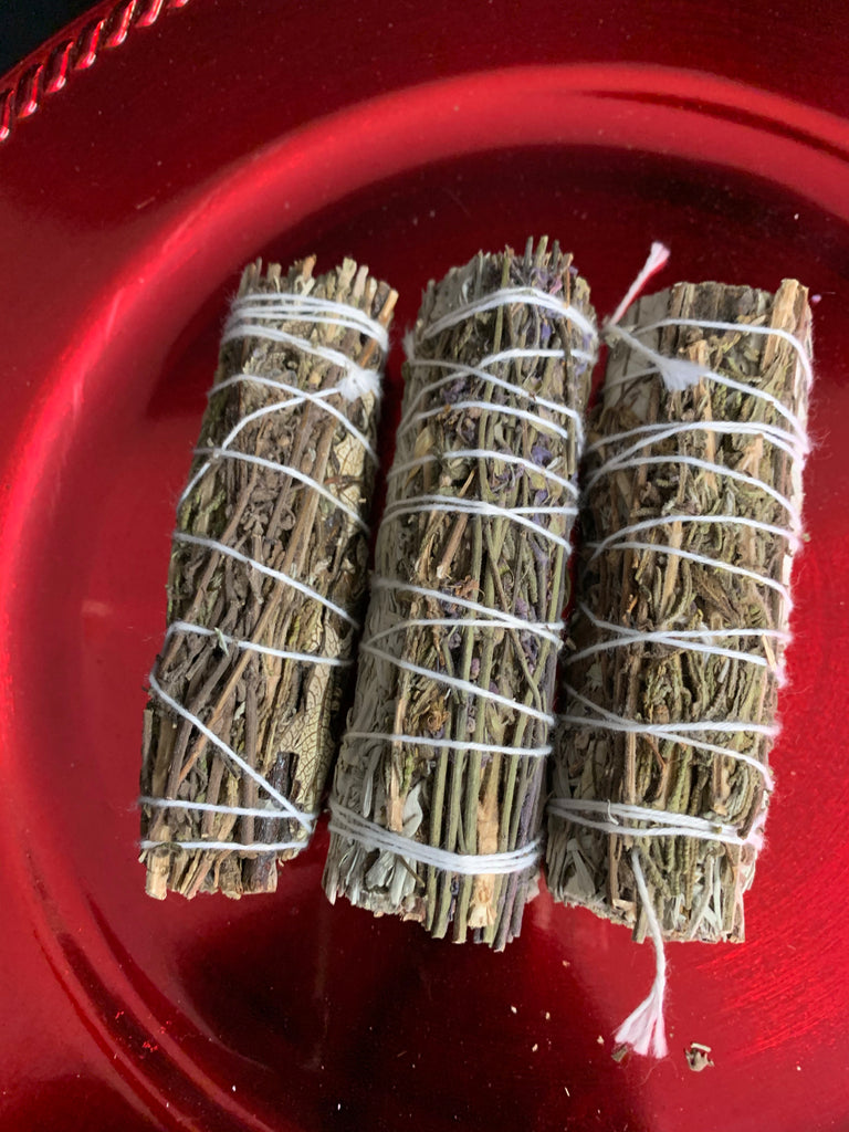 White sage drives away bad energy, cleanse and purify. Blue Sage has a wonderful aroma to use for cleaning & purification. A mellow scent, but smells fresh went burnt. Yerba Santa is a healing smudge for protection and purification, Lavender helps overcome stress and clears away negative energies.